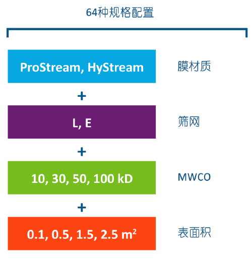 宽泛的截留分子量、膜表面积规格以及多种膜材质和筛网类型,可为满足您不同的工艺需求,提供多样化的选择。