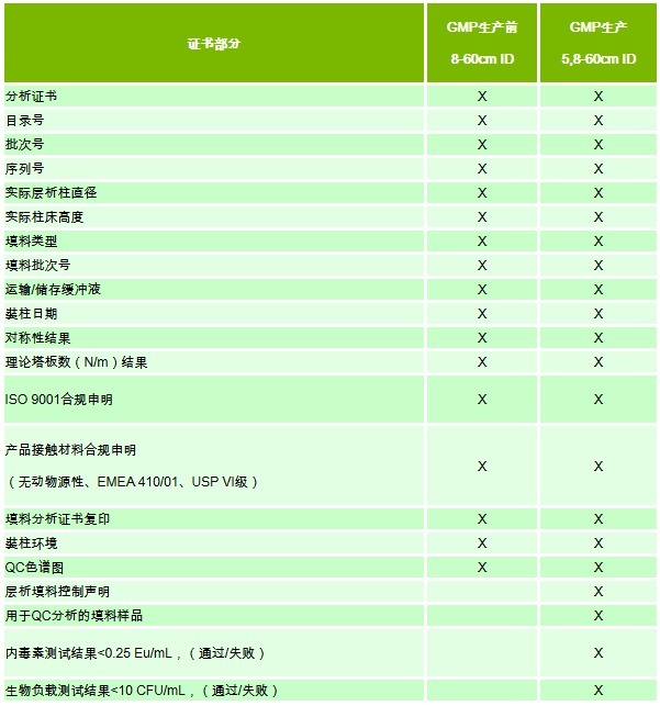 为提供最大的灵活性,OPUS®预装柱可应用非GMP和GMP应用。除下表所标注外,一般情况下,OPUS® 非GMP和GMP预装柱是一致的。OPUS® 非GMP预装柱不提供填料样品。OPUS® GMP预装柱提供填料样品,以便在终端用户工厂进行填料一致性测试。