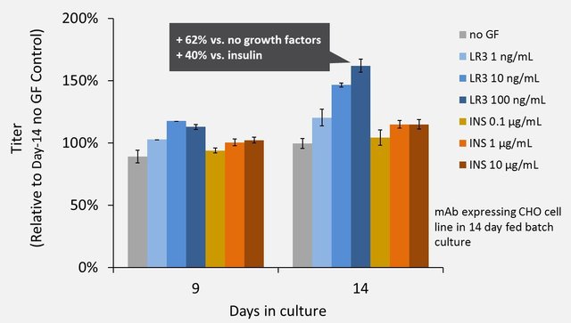 在CHO细胞培养中,相比不添加补充物的细胞培养,添加LONG® R3 IGF-I可使单位体积产率提高达62%,而相对补充胰岛素的细胞培养,可提高42%。 |