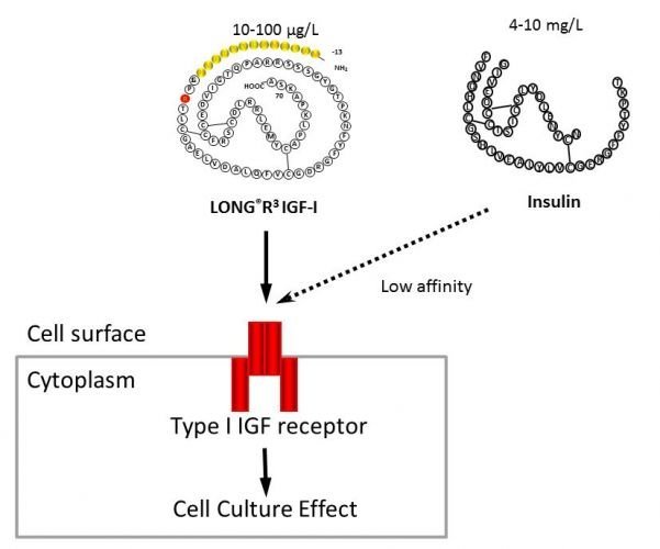 与胰岛素不同,LONG®R3 IGF-I 可特异性地靶向并激活I型IGF受体(IGF-IR),从而导致下游信号级联更高的激活,而后者与增值和抑制凋亡有关。这些关键通路更高的激活可获得更高的细胞密度、更高的活性以及增强细胞培养产率。
