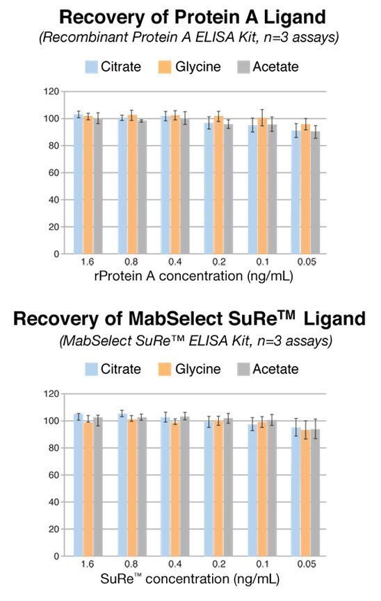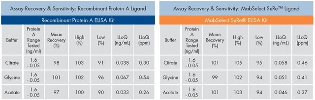 ELISA试剂盒可对脱落的天然和重组Protein A、MabSelect Sure™、NGL-Impact™ A 配基以及LONG® R3 IGF-I细胞培养添加物进行快速、可靠且可重复的定量检测。