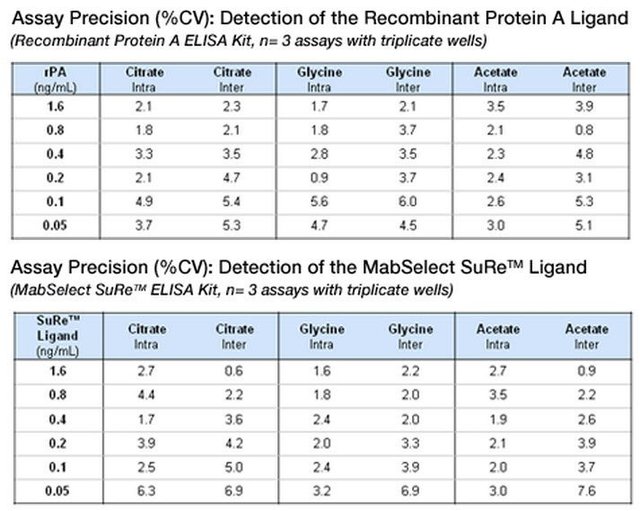 以上数据使用Dilute & Go(稀释 & 运行)方法获得。在所有情况下,样品缓冲液/hIgG在6种不同Protein A浓度水平、在3个独立分析中重复检测3次。确定重组Protein A 和MabSelect SuRe™试剂盒的精确性(分析间和分析内)。常用的缓冲液为100mM 甘氨酸、100mM醋酸盐以及100mM柠檬酸盐。所有缓冲液在pH 3.0下制备,并用Tris-碱中和至pH 7.6。每种含有5mg/mL的人多克隆IgG。