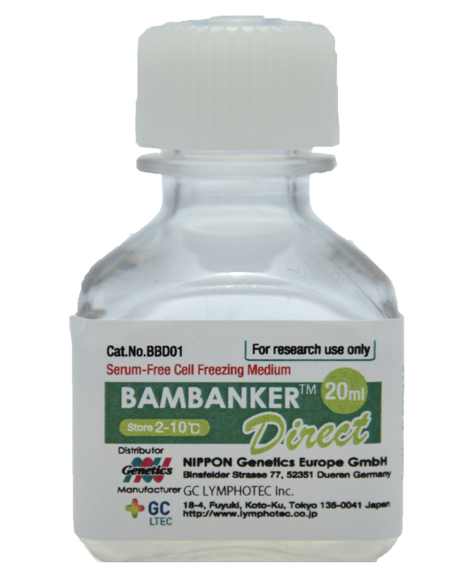 ◎ Bambanker™ HRM · 适用于人干细胞冻存 · 由人血清白蛋白制成,没有动物成分 杂交瘤细胞等对外部条件变化极其敏感,Bambanker™ Direct针对此类敏感细胞作出特殊优化,细胞无需离心直接加入与培养基等体积混合的Bambanker™ Direct即可完成冻存,且不含血清。